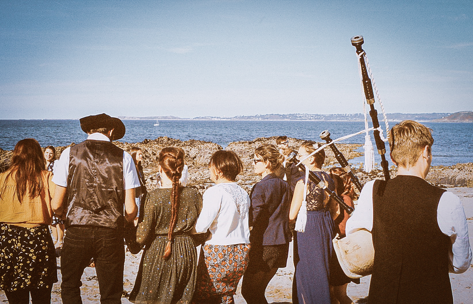 Les sonneurs marquent le pas sur la jetée. Sur la plage, on se retourne, on plisse les yeux et on chantonne. Je crois que je pleure. Au son du biniou et de la bombarde, les pieds nus se balancent dans le sable et les petits doigts s’enlacent.
